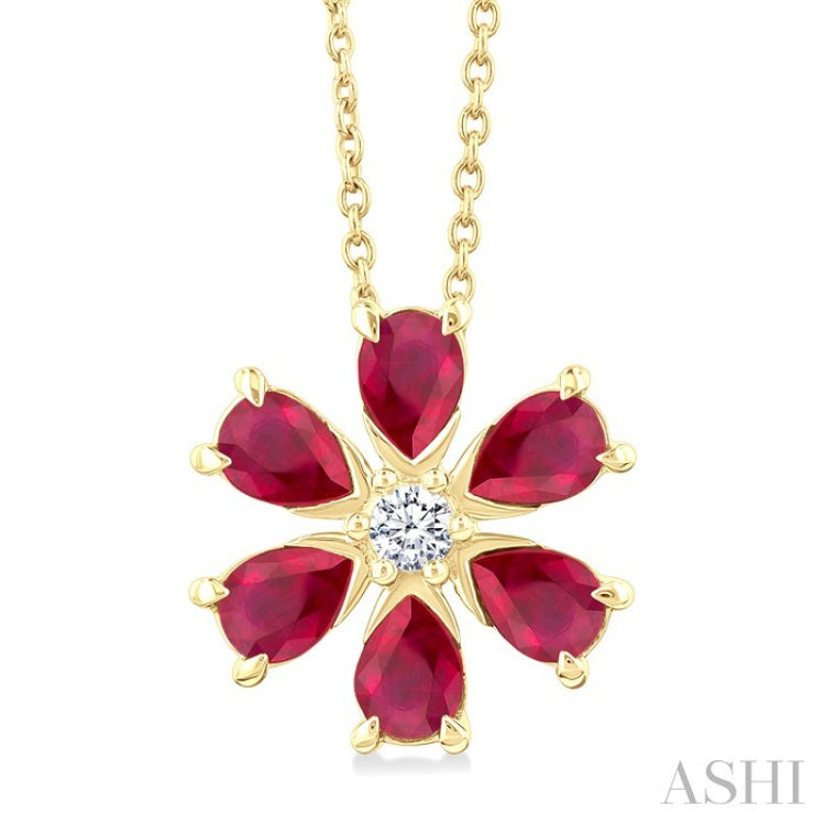 4X3 MM Floral Blossom Pear Cut Ruby and 1/20 Ctw Round Cut Diamond Precious Pendant With Chain in 14K Yellow Gold
